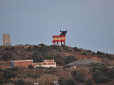 Vi taler om strukturen af den kendte Osborne-tyr, der står på en bakketop i Torreblanca i Fuengirola, som lørdag morgen var malet over med de republikanske farver; rød, gul og lilla.