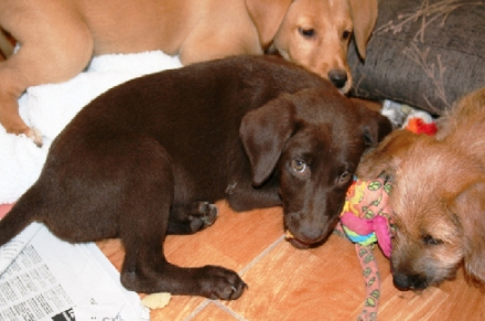 Lækre, brune Kwek blev fundet sammen med to hvalpe af samme kuld. Kærlig og legesyg labrador-blanding, som bliver mellemstor. Læs mere om Kwek her