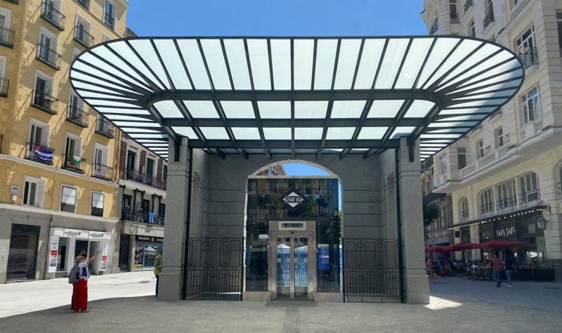 - Hans ikoniske "templetter" (små tempellignende indgange) med glas og jern er symboler på Madrileños metro.
