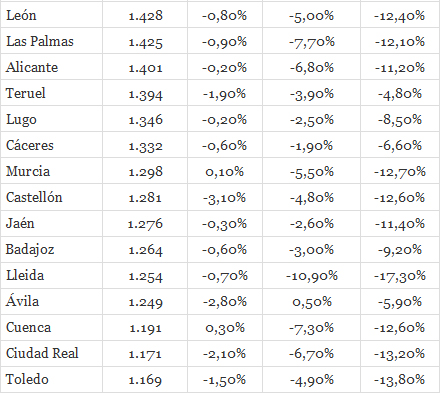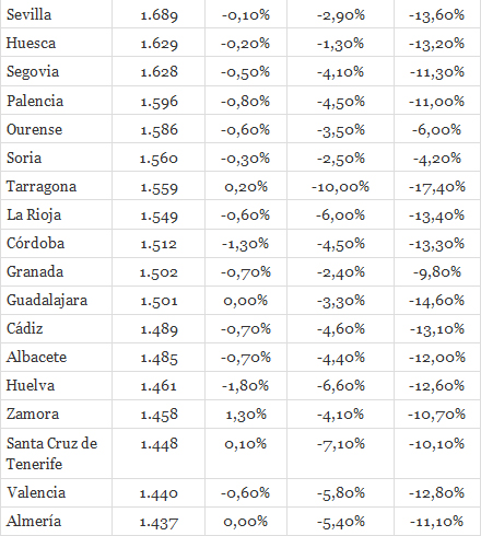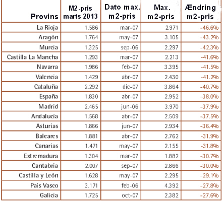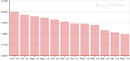 fotocasa.es indførte i januar 2008 et indeks for m2-priserne, der blev fastsat til 100. I maj var indekset faldet til 748, hvilket svarer til en gennemsnitlig m2-pris på 1.794 euro på landsbasis.