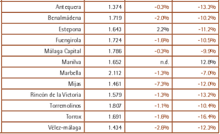 Som det fremgår, er der i det seneste kvaratl tale om prisstigning i Estepona, ingen ændring i Manilva, hvor der på årsbasis tillige er talee om en stigning på 12,8 procent.