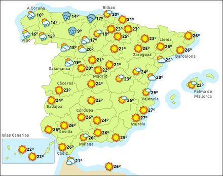 Madrid får i dag letskyet vejr med mellem 9 – 21 grader, Barcelona letskyet 17 – 27, Valencia letskyet 14 – 30 grader og Málaga solrigt, 19 – 27.