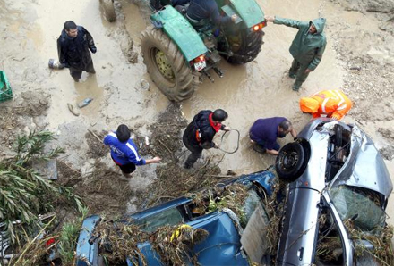 En mand løber ned ad en gade i byen Villanueva del Rosario; en af de regnramte kommuner, hvor vandet har fejet flere køretøjer af vejen.