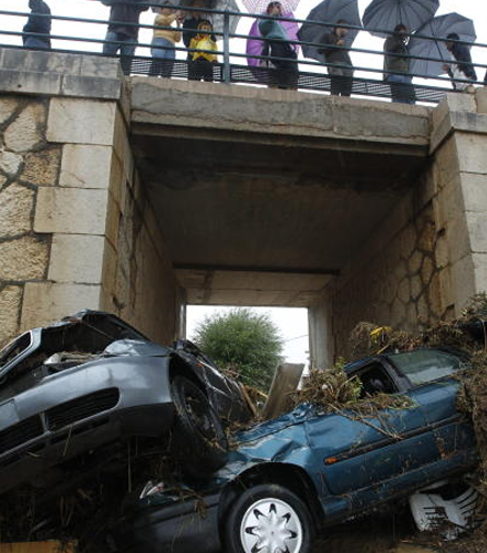 To biler sidder fast under en bro i Villanueva del Rosario