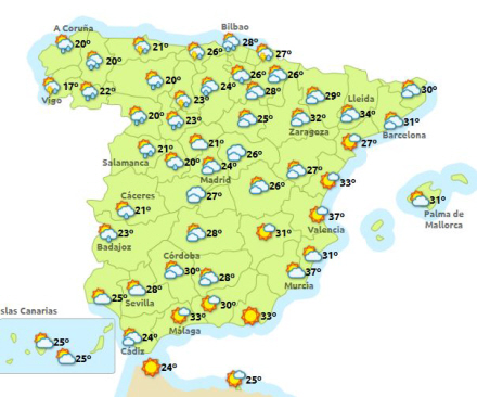 Costa Blanca får masser af sol, men går også fri af den værste hede. I dag endnu letskyet, ret svag vind fra skiftende retning og mellem 25 og 30 grader. Natten til i morgen bliver ret varm, med laveste temperaturer på 27 grader! I løbet af dagen op til 31 grader. Natten til mandag bliver lidt svalere, nemlig ned til 24 grader, og resten af ugen kommer termometret til at ligge på mellem 24 og 30 grader. Onsdag drejer vinden i øst, og det bliver lidt mere blæsende.
