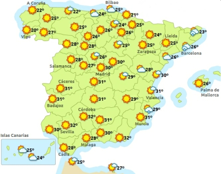 Vejret i Spanien, lørdag klokken 14:00