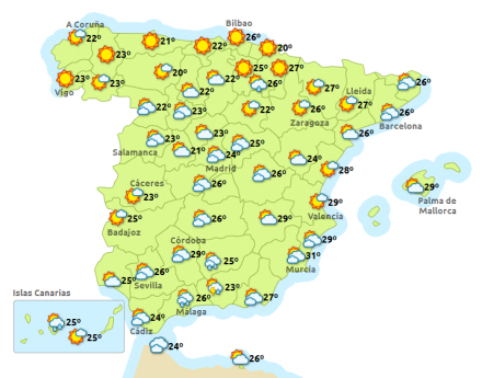 Vejret i Spanien, lørdag klokken 14:00