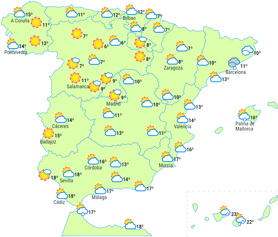 Dagstemperaturerne er uændrede eller stigende på Atlanterhavssiden og faldende på resten af halvøen. De er uændrede på Balearerne og De Kanariske Øer. Nattemperaturerne vil falde på den nordlige halvdel af halvøen og stige på den sydlige halvdel. Generelt let frost på den nordlige højslette og i de centrale og nordlige bjerge og varsel om lokalt kraftig frost i Pyrenæerne.