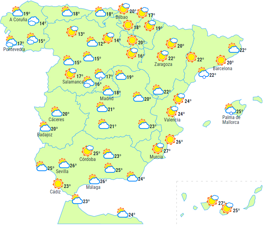 Dagstemperaturerne falder på det meste af halvøen undtagen i Middelhavsområdet, på den helt sydvestlige del og De Kanariske Øer, hvor de forbliver uændrede eller stiger lidt. Overvejende faldende nattemperaturer. Sandsynlighed for svag frost i den vestlige del af De Cantabriske Bjerge.