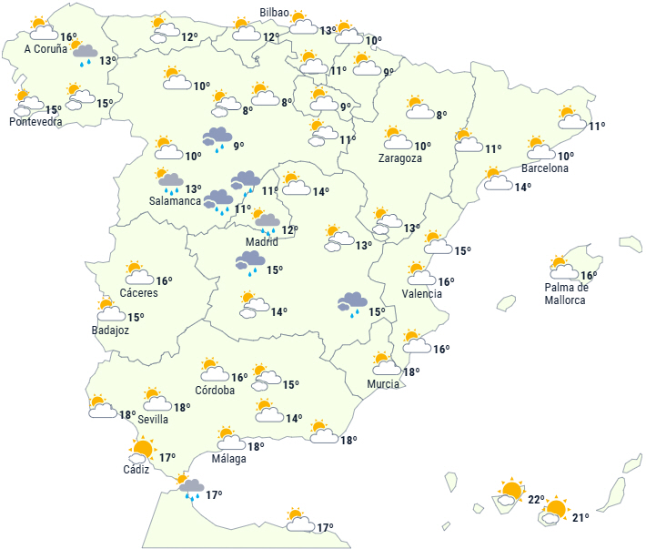 Dagens temperaturer vil generelt være stabile, men i Nordspanien forventes en mindre temperaturstigning. De største ændringer sker om natten, hvor temperaturerne vil stige næsten overalt på halvøen.