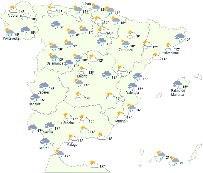 Vejret i Spanien er fortsat præget af en atlantisk strømning, der påvirker den nordlige halvdel af landet. Det betyder overskyet vejr og svage regnbyger i store dele af det nordlige af fastlandet, men især langs Galiciens kyst.