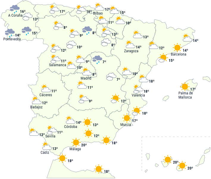 Passagen af en ny Atlanterhavsfront forventes at give ustabilt vejr til den nordvestlige del af halvøen med rigeligt med skydække og nedbør til Galicien og områderne langs Det Cantabriske Hav, men det kan også nå andre dele af den nordvestlige del og Pyrenæerne.