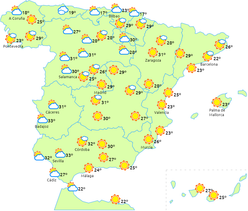 Letskyet eller skyfri himmel over halvøen og Balearerne med enkelte perioder med højtliggende skyer. Kun i de indre egne af den østlige halvdel af fastlandet kan der komme lidt tættere skydække i bjergområderne om eftermiddagen - måske enkelte byger i de østlige Pyrenæer.