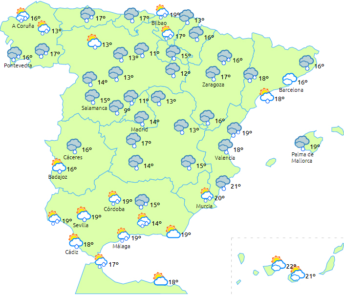 En atlanterhavsfront, der er forbundet med stormen Evelyn, forventes at krydse halvøen fra vest mod øst med skyet eller overskyet vejr, efterhånden som den passerer. Det betyder også udbredt nedbør ledsaget af lejlighedsvis tordenvejr på Atlanterhavssiden, ved nordvestkysten samt i Gibraltarstrædet. Mest regn til den vestlige tredjedel af halvøen.