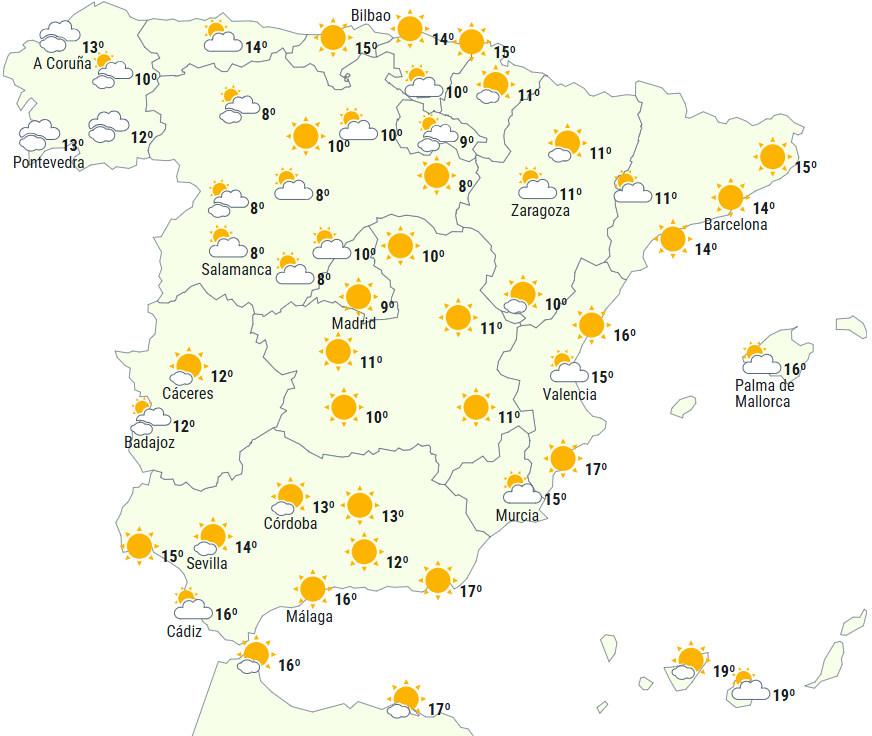 Dagstemperaturerne vil falde på den østlige del af halvøen, langs Alborán, det indre nordvestlige område af halvøen og de sydlige dele af De Kanariske Øer, mens der sker få ændringer på resten af De Kanariske Øer og De Baleariske Øer og overvejende stigning i resten af landet.