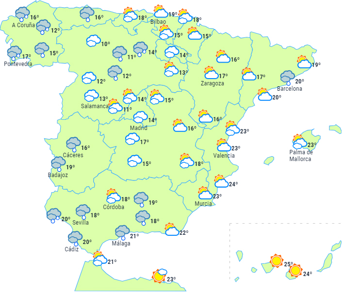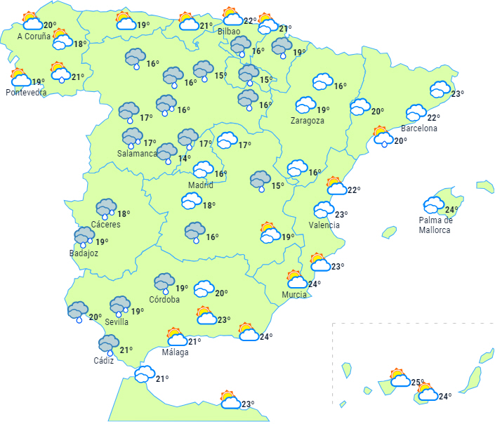 Overvejende skyet eller overskyet himmel med nedbør på den vestlige den af halvøen, og det bevæger sig fra sydvest til nordøst og påvirker alle Atlanterhavsområderne og den vestlige ende af nordvestkysten. I mindre grad kan det også komme til at påvirke resten af halvøen og De Baleariske Øer, men det er usikkert hvor meget.