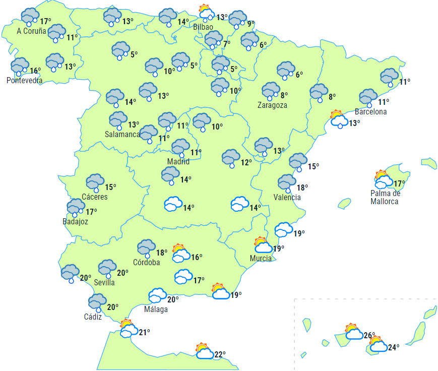 Skyet eller overskyet himmel over det meste af halvøen og Balearerne. Kraftig nedbør - undertiden med tordenvejr - til den nordvestlige del af halvøen og den sydlige Atlanterhavsside, som lokalt kan være kraftig eller vedvarende i Galicien, den nordlige del af Andalusien og den vestlige del af de centrale bjerge samt den sydlige højslette.