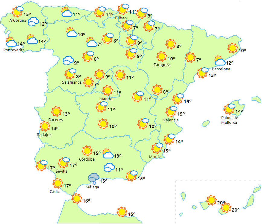 Lækkert, stabilt og generelt klart vejr til det meste af halvøen og Balearerne. I Middelhavsområdet forventes der dog overskyet i perioder med mulighed for svag og spredt nedbør, især i området omkring Málaga og resten af den sydøstlige del af halvøen.