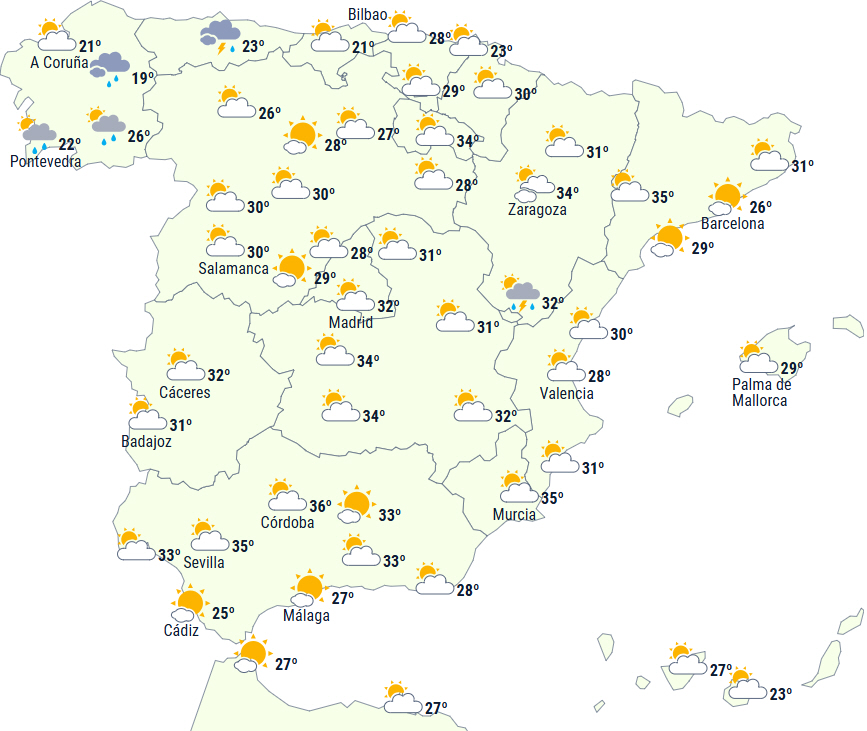 Der forventes temperaturer på 34 til 36 grader i lavlandsområder i Andalusien og den nordøstlige del af halvøen, samt lokalt på den sydøstlige del og i det indre af Mallorca.