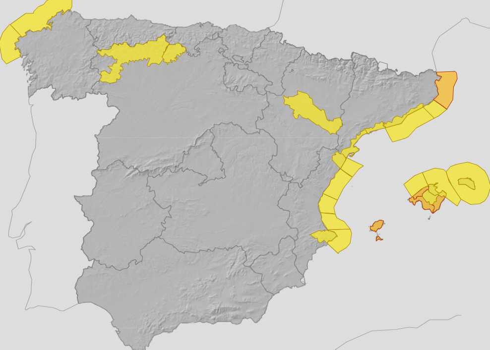 Der forventes kraftige byger i kystområderne i Catalonien og nord for Castellón, omkring Cape Nao og især på Balearerne, hvor de også forventes at være vedvarende og muligvis blive meget kraftige med mest vand til de vestlige øer.