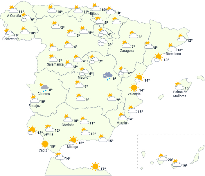 Skyet himmel, ledsaget af moderat nedbør ved kysten i løbet af dagens første halvdel, mens det bliver letskyet om eftermiddagen. Morgentåge med sandsynlighed for dis i bjergene. Minimumstemperaturer med små ændringer, mens maksimumstemperaturerne stiger, og dermed lander vi på 12 til 17 grader og fem til 11 i nat.