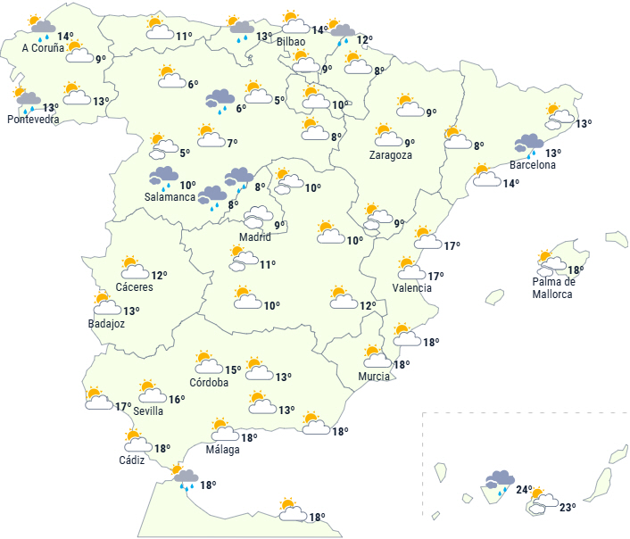 Det ustabile vejr forventes at fortsætte på halvøen og De Baleariske Øer med gråvejr og sandsynlighed for let nedbør i den sydlige halvdel, den nordøstlige tredjedel og Middelhavsområdet. Nedbøren forventes at være mere intens i den nordøstlige del af Catalonien, ved Alborán og på halvøens sydøstkyst.