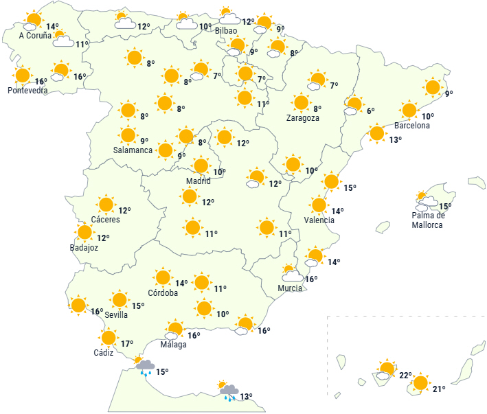 Dermed vil frosten blive mere udbredt og intens og påvirke det meste af halvøens indre egne. Der forventes tung frost på den nordøstlige del af halvøen, især i Pyrenæerne, såvel som i bjergene i det centrale nord og i højlandet.