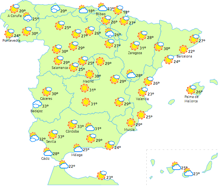 Der forventes en stigning i maksimumstemperaturerne i de fleste områder, men den vil være mere udtalt på Mallorca, i halvøens indre østlige Middelhavsområder, i det indre af Andalusien og i det nordlige Galicien. Temperaturerne kan nå helt op på 34 grader i Guadalquivir-dalen. Minimumstemperaturerne vil stige en smule i halvøens sydøstlige indre egne, på Balearerne og i den nordvestlige tredjedel af halvøen. Kun få ændringer i resten.