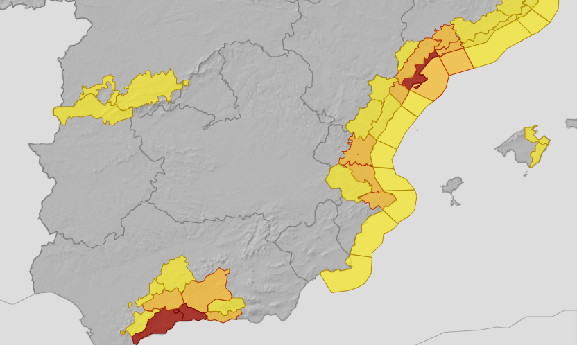 Lokalt kraftig og vedvarende regn, ledsaget af tordenvejr i og nær områderne langs Middelhavskysten og på Balearerne, men især bliver det vådt i dele fra Ebro-deltaet til Cabo de la Nao, Málaga og på Granada-kysterne, de vestlige af Balearerne, hvor det kan være meget kraftigt og endda voldsomt. Klik HER for at læse mere om alarm-farverne.