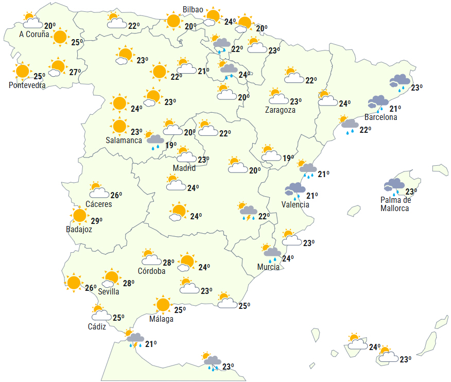 I de tidlige morgentimer kan byger og tordenvejr, som lokalt er kraftige, fortsætte på de cataloniske kyster. Ligeledes, dog med en vis usikkerhedsmargin med hensyn til lokalisation, forventes fra de tidlige timer let til overskyet himmel over store dele af indlandet med byger ledsaget af torden i det centrale-sydlige og centrale-østlige og bjergområder generelt.