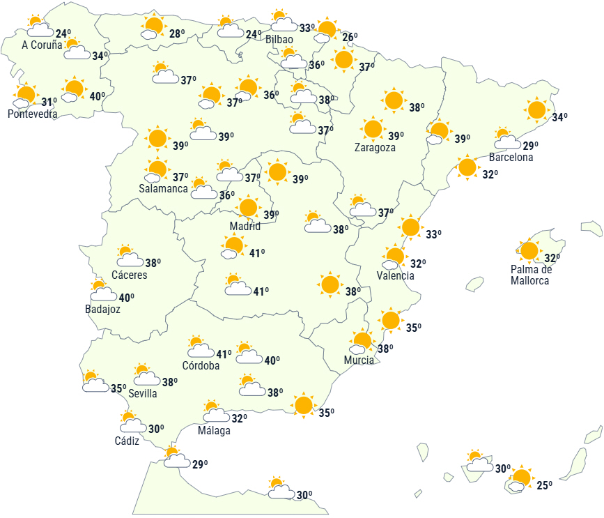 Temperaturen vil overstige 35 grader på størstedelen af den sydlige halvdel af Den Iberiske Halvø, i højlandet i nord, i den sydlige del af Galicien, i de nordøstlige dale samt på dele af De Kanariske Øer og De Baleariske Øer. Op til 40 grader i dalene på den sydlige atlantiske side.