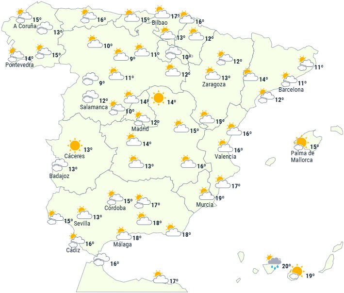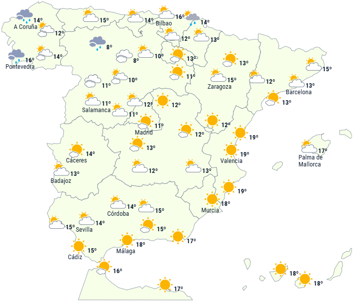 Dagstemperaturerne stiger i det meste af halvøens indre egne og på Balearerne, bortset fra i områder med tåge. Der vil ikke ske de store ændringer langs kysterne og på De Kanariske Øer.
