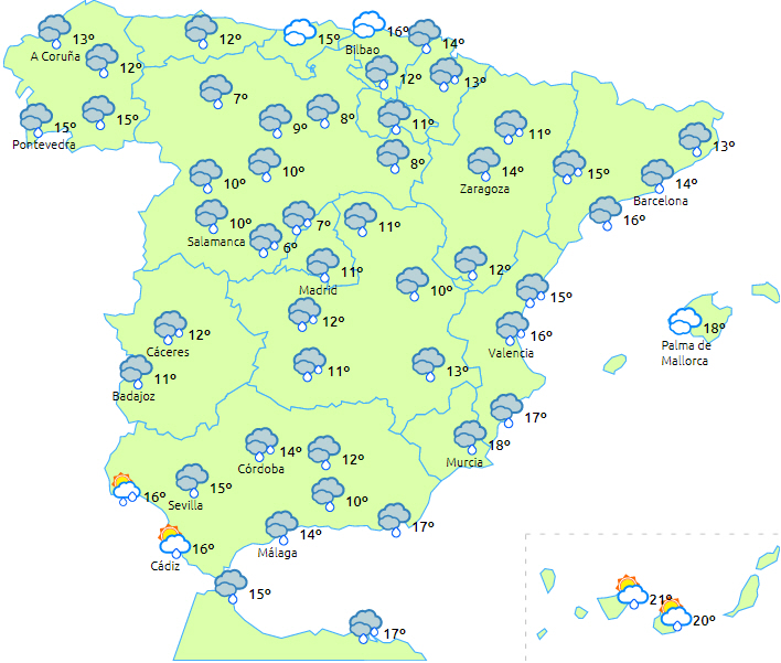 Et lavtryk fra Atlanterhavet med tilhørende frontsystem vil ligge sydvest for halvøen, og det giver skyet eller overskyet vejr og udbredt nedbør, om end det er noget ujævnt fordelt. I første omgang forventes der nedbør på østkysten og med mindre sandsynlighed på Balearerne. I anden halvdel af dagen forventes nedbøren af falde på den nordlige og vestlige tredjedel af halvøen.