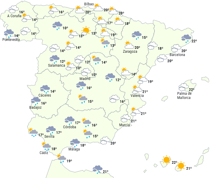 - Heldagsregn i Sistema Central, det vestlige Galicien, det vestlige Andalusien og Pyrenæerne, som kan være kraftig og blive ledsaget af torden i det vestlige Andalusien og lokalt på den nordøstlige del af Den Iberiske Halvø.