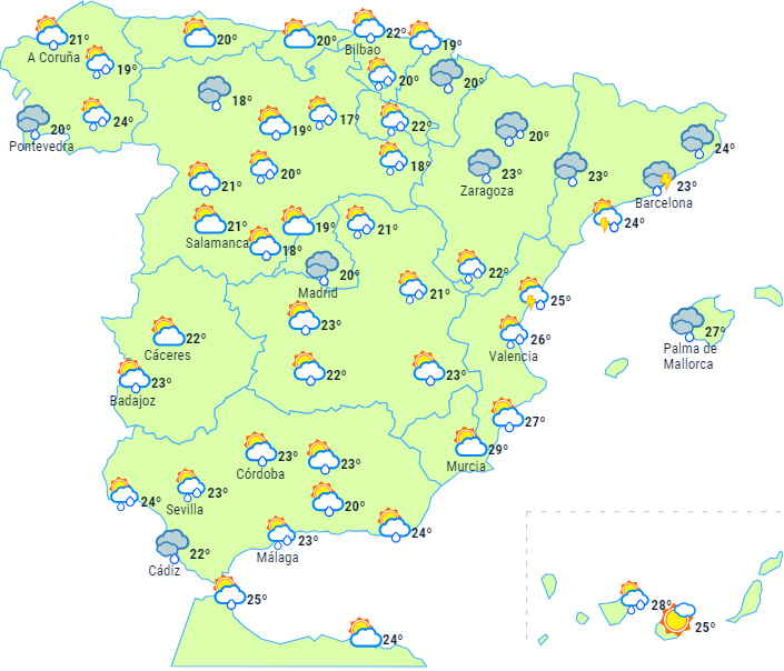 Sandsynlighed for regn i de sydøstlige bjerge og mulighed for kraftig regn i området ved Gibraltarstrædet, hvor det kan blive ledsaget af tordenvejr om eftermiddagen. Svagere og mere spredt nedbør kan forekomme i det indre af den nordvestlige halvdel, resten af Andalusien og på De Kanariske Øer, men der ventes dog mest regn i de vestlige Pre-Pyrenæer, de centrale bjerge, Andalusien og de bjergrige øer.