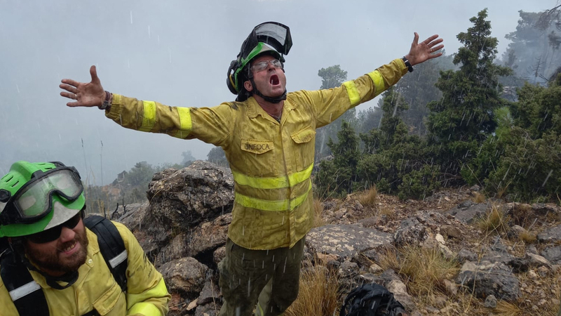 Billedet herover er fra skovbranden i Coto Ríos i Jaén, Andalusien, som blev deklareret søndag. Her hilser man tydeligvis dråberne fra himlen velkommen, og branden blev da også stabiliseret tirsdag. Og der er udsigt til mere regn i dag.