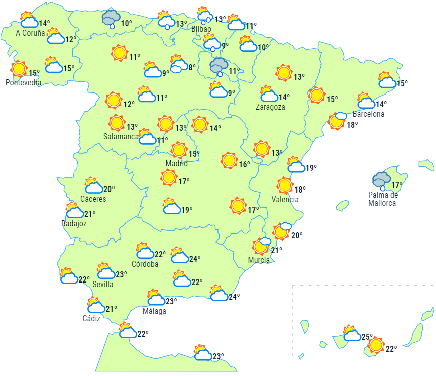 En fugtig vind fra nord forventes at give skyet eller overskyet himmel til det nordlige Galicien, nordvestkysten, den øvre Ebro-dal, de nordlige af De Iberiske Bjerge samt i Pyrenæerne. Det kan give lette byger i det østlige Cantabrien og Pyrenæerne samt - dog mere spredt og lejlighedsvis - i resten af Cantabrien og det nordøstlige Galicien.