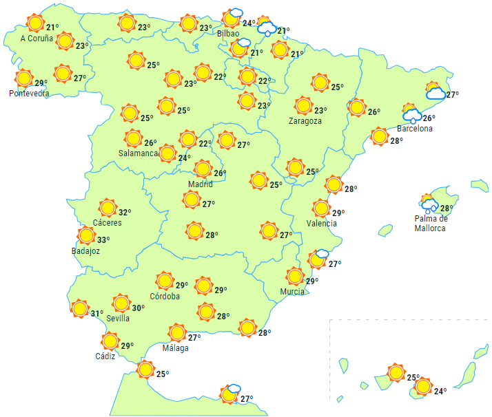 Der forventes stabilt vejr i det meste af landet med letskyet eller klar himmel, selvom det østlige Middelhavsområde forbliver under indflydelse af en DANA, og det giver ustabilitet ved Cataloniens kyster, omkring Cape Nao i Alicante og på Balearerne med kraftige byger og tordenvejr - lokalt tung nedbør på Balearerne.