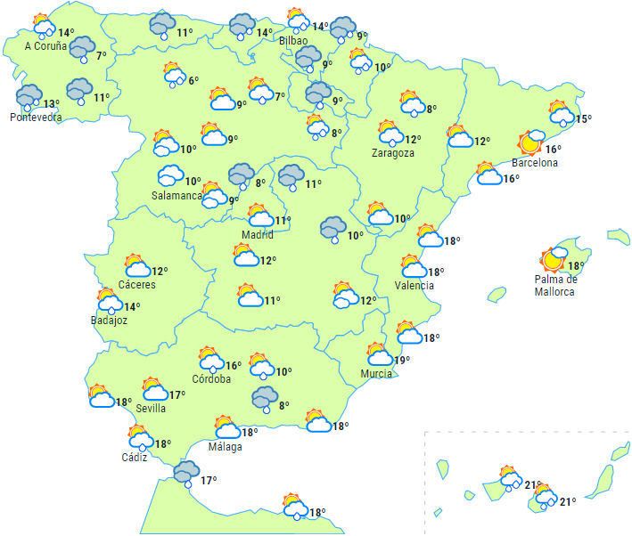 Overskyet himmel over den nordlige halvdel af halvøen med vedvarende og udbredt nedbør i Galicien, Cantabrien og de centrale og vestlige Pyrenæer, som lokalt kan være kraftig i kystområderne ved Det Cantabriske Hav og i nærheden heraf.