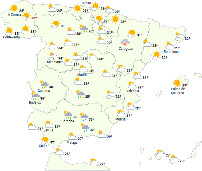 Temperaturerne overstiger 34 til 36 grader på størstedelen af den sydlige halvdel af fastlandet, dele af det nordlige højland, nordøstlige dale og lokalt i nordvest. Det er sandsynligt, at vi overstiger 38 til 40 grader på den sydlige del af Den Iberiske Halvøs atlantiske side.