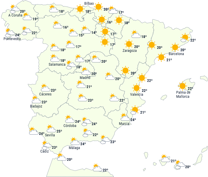 Dagstemperaturerne forventes generelt at stige generelt på Den Iberiske Halvø og De Baleariske Øer. Nattemperaturerne falder på den nordvestlige del, mens der forventes lette stigninger i resten af landet. På De Kanariske Øer forventes ingen væsentlige ændringer. Svag frost i Pyrenæerne.
