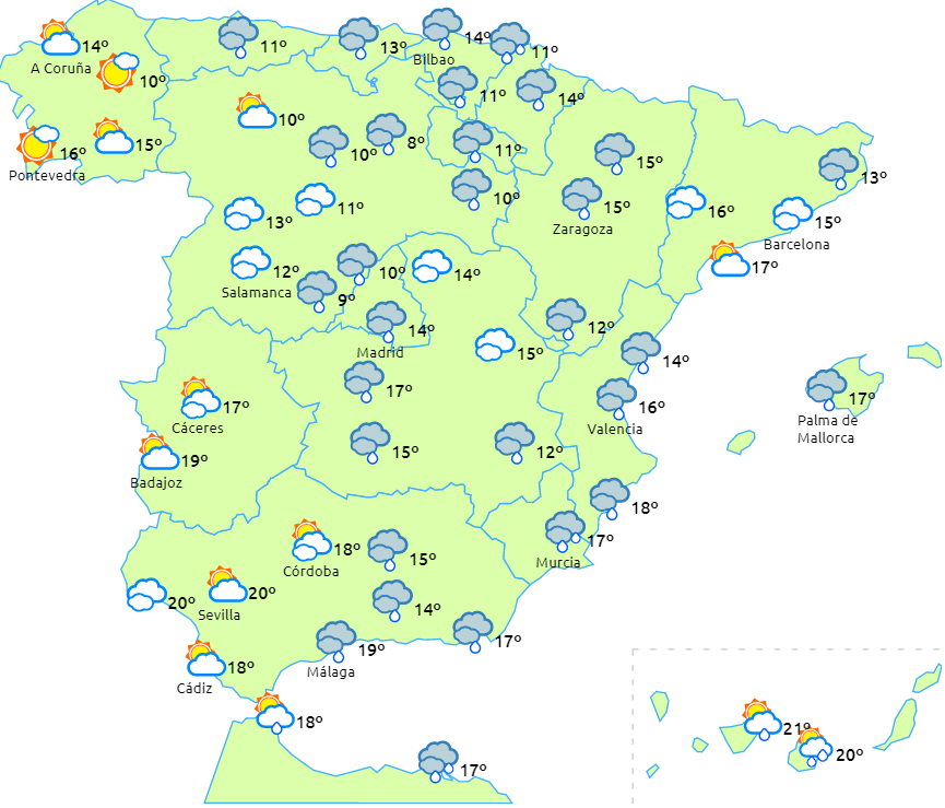 Men en ny Atlanterhavsfront vil trænge ind over den nordvestlige del af halvøen og give tiltagende skydække der og nedbør i Galicien, ved nordvestkysten, den øvre Ebro-dal og den vestlige halvdel af Pyrenæerne.
