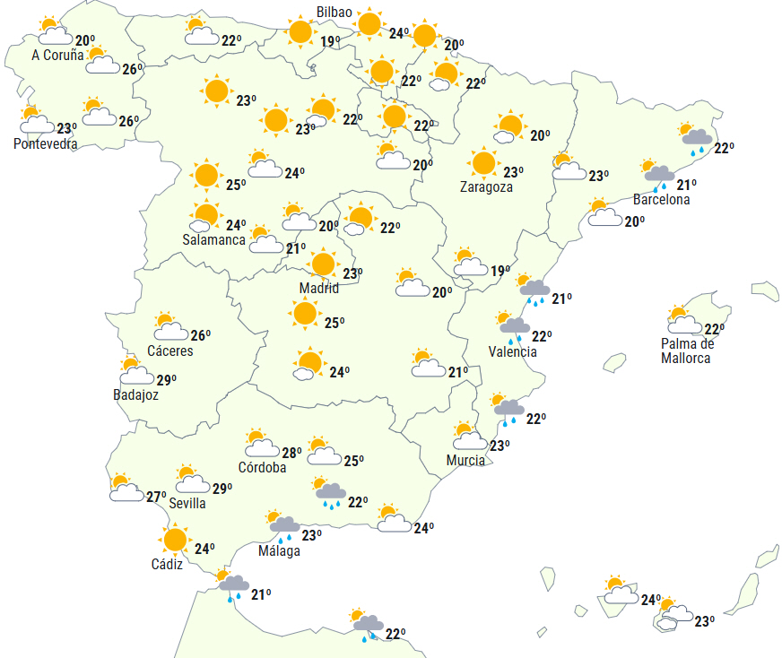 Der forventes letskyet himmel fra dagens første timer, og byger kan ikke udelukkes ved kysten af Catalonien og omkring Valencia-bugten. Ligeledes vil middel- og højtliggende skydække øge fra sydvest, hvilket betyder overskyet himmel over den sydlige halvdel.