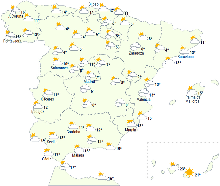 Overvejende letskyet eller klar himmel over halvøen og Balearerne. Kun tilnærmelsen af en front fra Atlanterhavet vil give tiltagende skydække med nedbør i den vestlige del af Galicien, og det kan ende med at påvirke andre dele af den vestlige del af halvøen og den vestlige ende af områderne langs Det Cantabriske Hav.