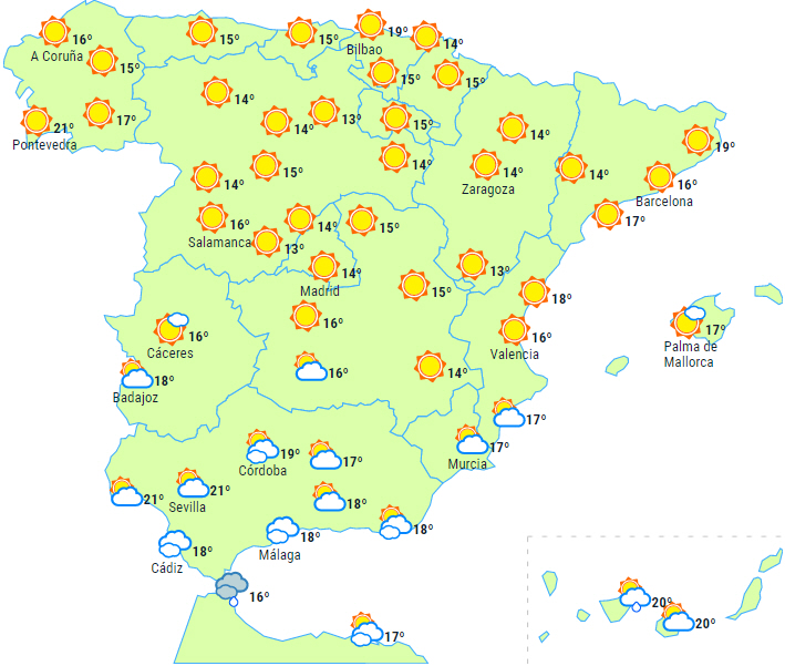 Der forventes også lavthængende skyer om morgenen og sandsynligvis morgentåge til den nordøstlige del af Galicien, dele af den nordlige Middelhavskyst, Balearerne og det sydøstlige indland.