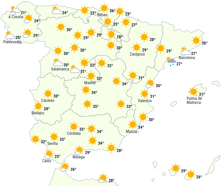 Kun i det nordvestlige Galicien og det østlige Catalonien forventes skyet vejr med mulighed for svage og spredte byger, som sammen med flere skyer i løbet af dagen vil påvirke bjergene på den nordlige og østlige del af fastlandet, og det kan brede sig i form af spredte byger til Cantabrien, de østlige Pyrenæer eller det sydlige af De Iberiske Bjerge.