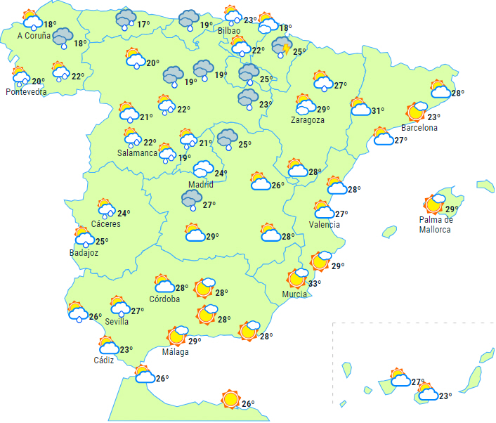 En Atlanterhavsfront forventes at trække ind over halvøen, hvilket giver øget skydække over den nordvestlige halvdel. I Galicien, det vestlige Cantabrien og en del af det nordlige højland forventes skyet eller overskyet himmel med nedbør, mest vådt og lejlighedsvis ledsaget af tordenvejr i Galicien og Asturien. Lokalt vedvarende i Rías Baixas.