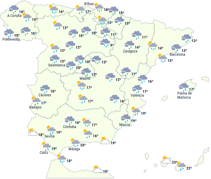 Nedbør kan også nå andre steder af halvøen og De Baleariske Øer, men det skulle holde tørt i det nordøstlige hjørne og ved Cantabrien.