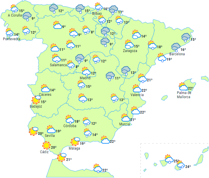 En fugtig vind fra Atlanterhavet blæser fortsat ind over halvøen og Balearerne og med flere på hinanden følgende fronter, som bevæger sig fra nordvest til sydøst, bliver det skyet eller overskyet i Atlanterhavsområderne, i nordvest og Pyrenæerne.