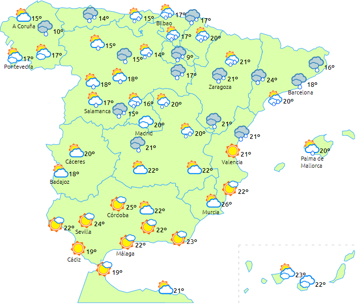 Dagstemperaturerne vil falde i det meste af landet, mens vi fortsat ligger over normalen på De Kanariske Øer, hvor man nogle steder kan komme over 30 grader. Nattetemperaturerne vil falde på den nordvestlige del af halvøen med frost i Pyrenæerne og i de nordvestlige bjerge.